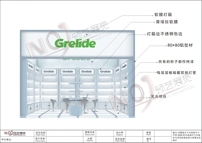 契合格來德的品牌形象和產品特性,采用框型結構,再搭配燈具燈光的效果,襯托出展位自由、簡約的氛圍,突出一種現代、舒適的時尚品味。