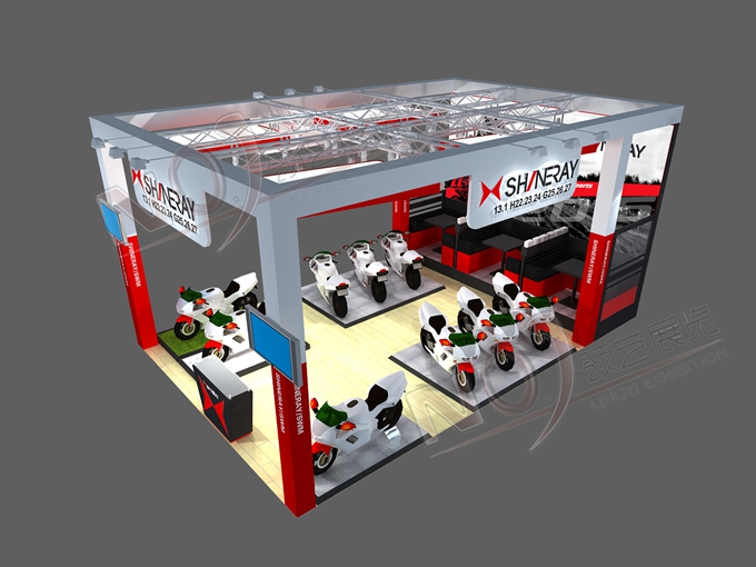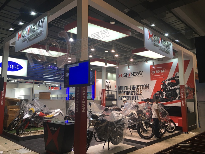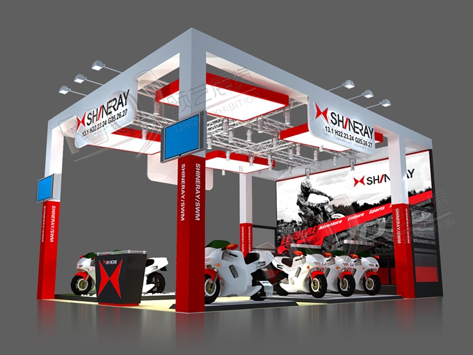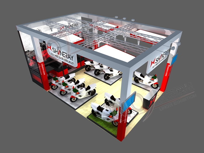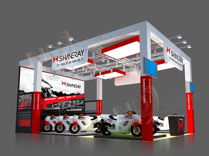 契合鑫源摩托的品牌形象和產品特性,采用矩形結構,再搭配燈具燈光的效果,襯托出展位簡約、時尚的氛圍,突出一種現代、簡約的時尚品味。