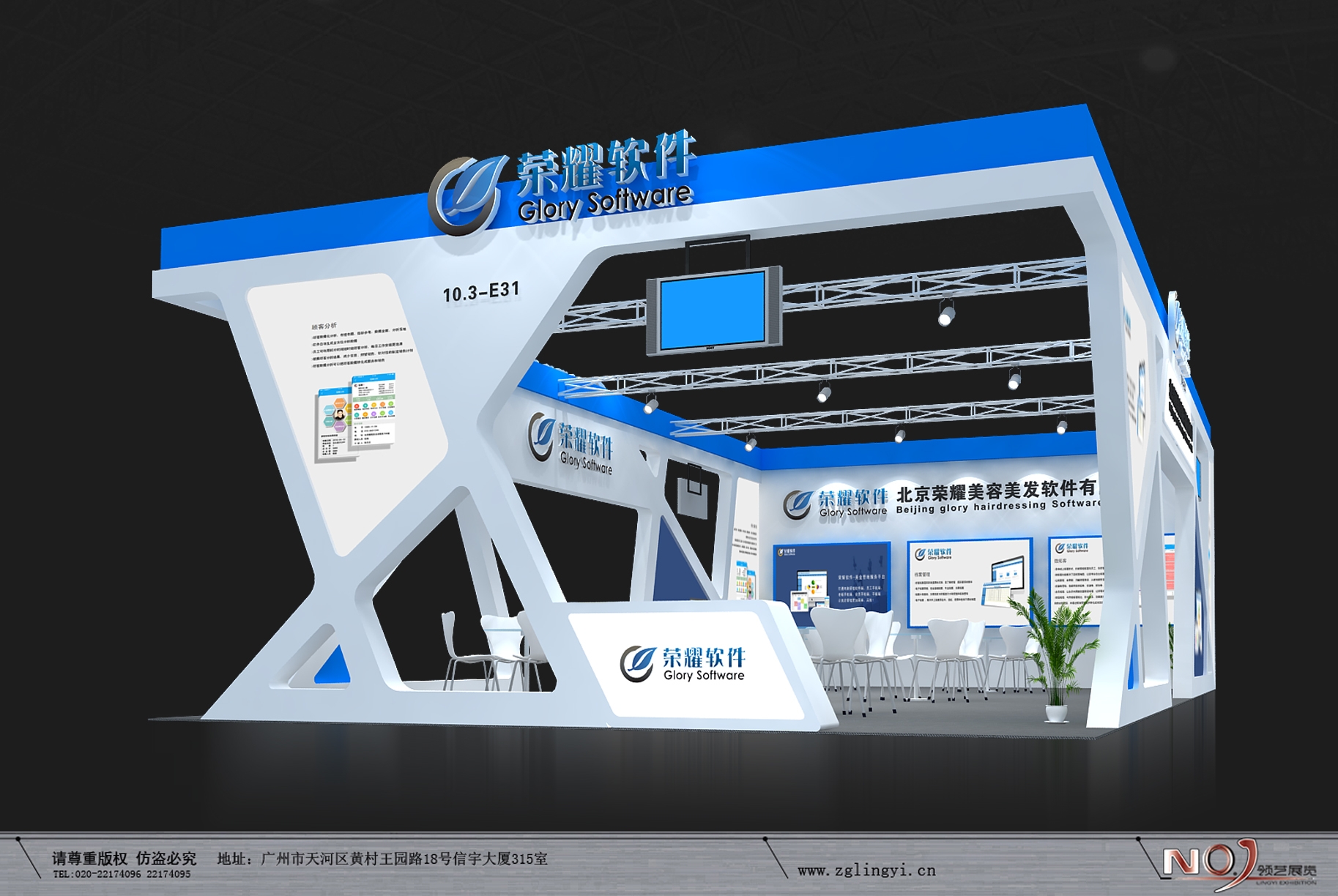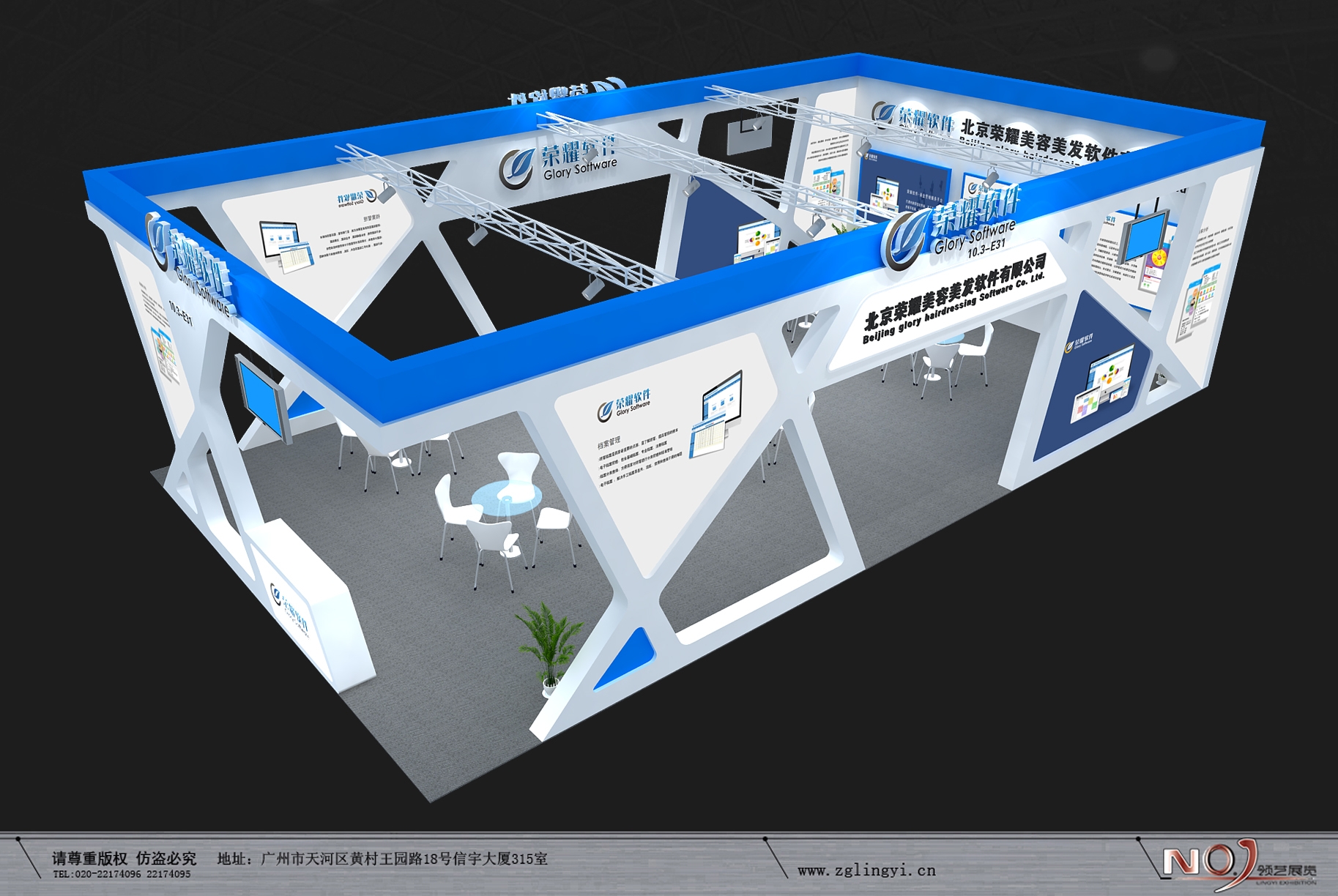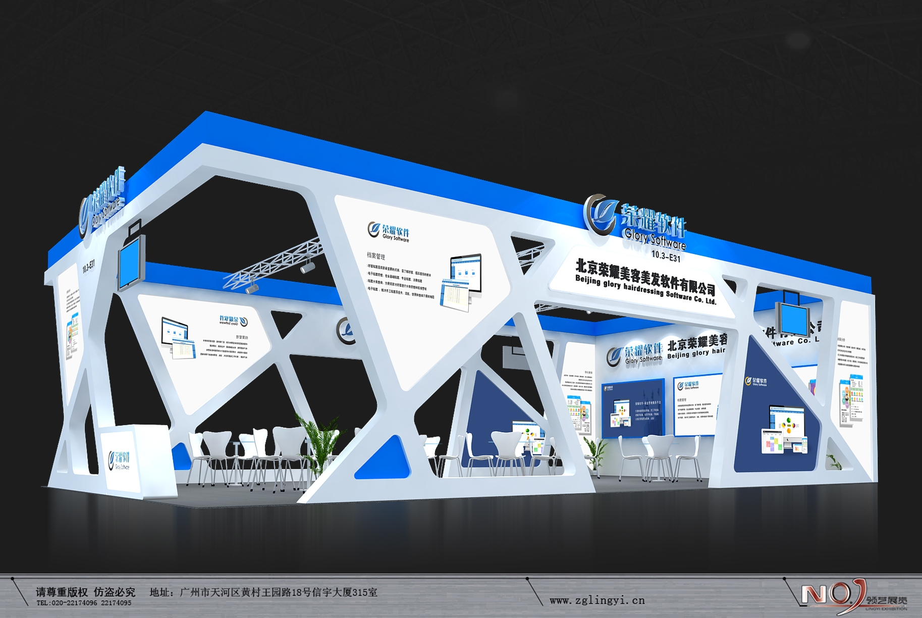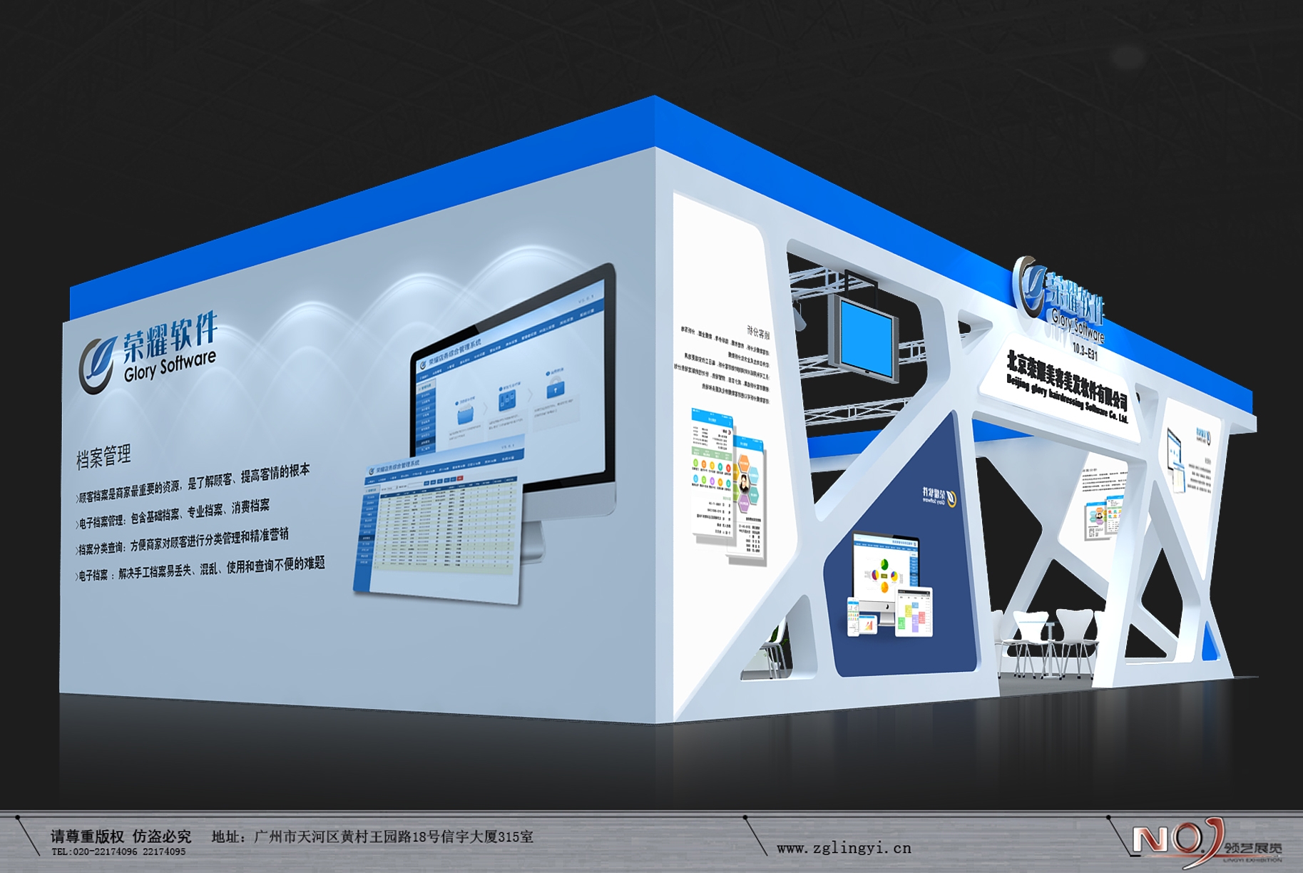契合榮耀軟件的品牌形象和產品特性,采用線條,再搭配燈具燈光的效果,襯托出展位簡約、舒適的氛圍,突出一種現代、高端的時尚品味。