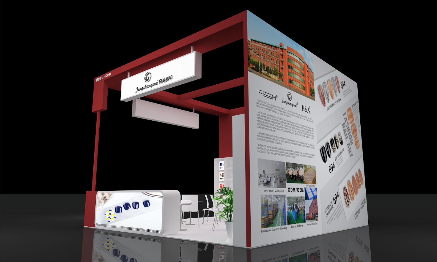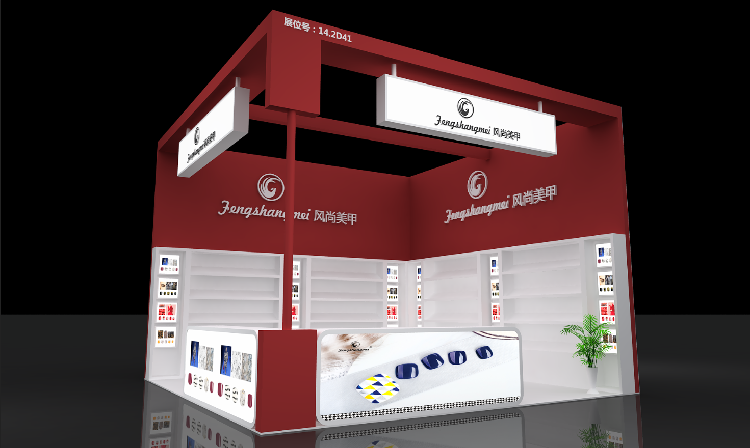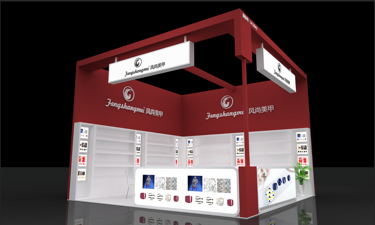 契合風尚美甲的品牌形象和產品特性,采用矩形結構,再搭配燈具燈光的效果,襯托出展位大氣、豪華的氛圍,突出一種簡約、時尚的品味。