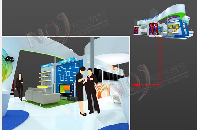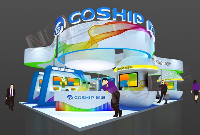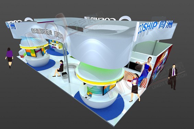 契合同洲電子的品牌形象和產品特性,采用曲線、框型結構,再搭配燈具燈光的效果,襯托出展位休閑、舒適的氛圍,突出一種躍動、簡約的時尚品味。