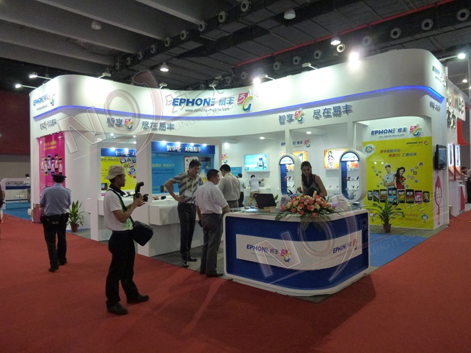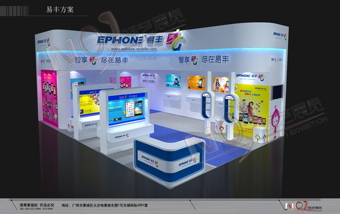 契合易豐手機的品牌形象和產品特性,采用框型結構,再搭配燈具燈光的效果,襯托出展位簡約、便捷的氛圍,突出一種精致、簡約的時尚品味。