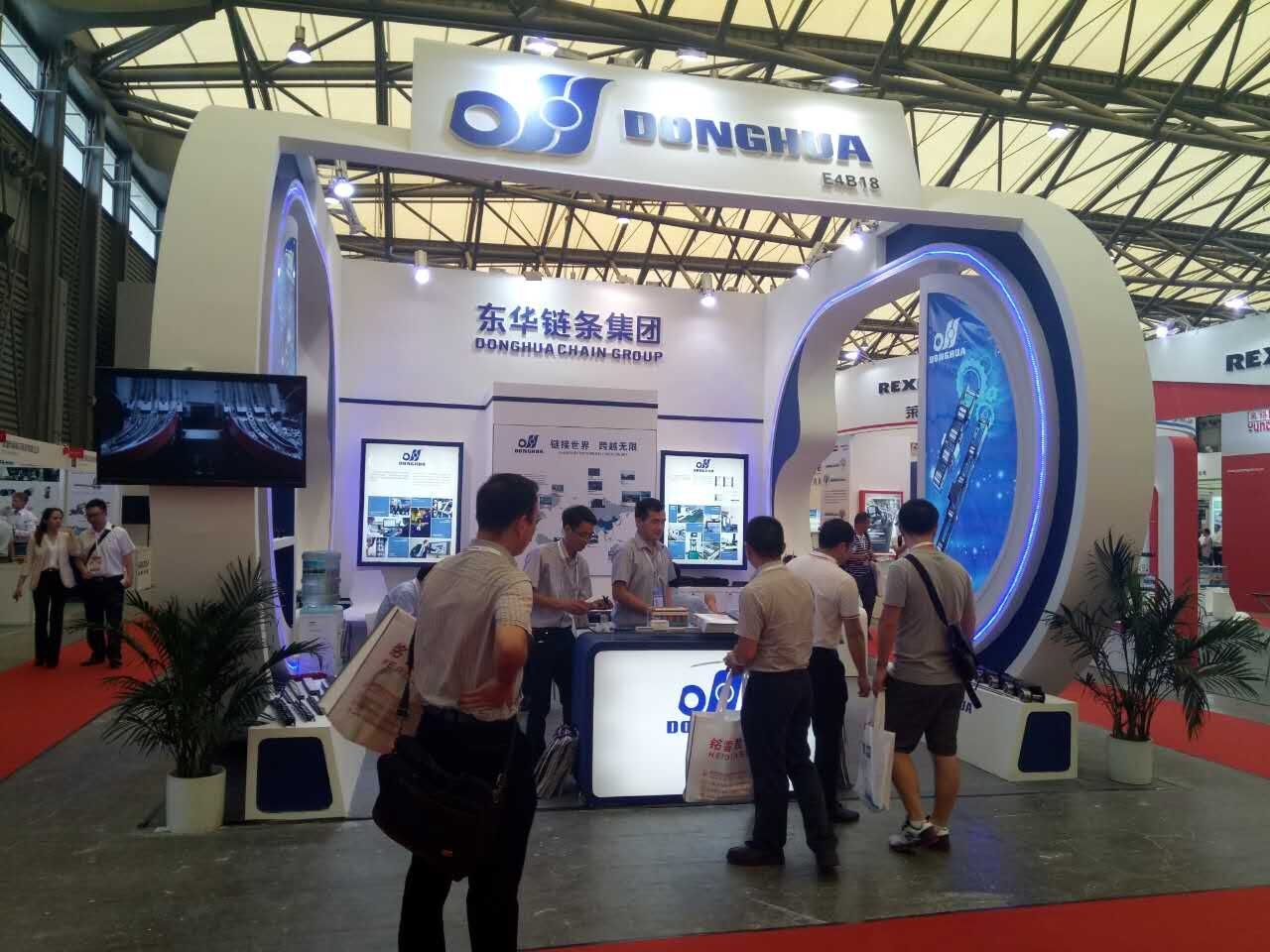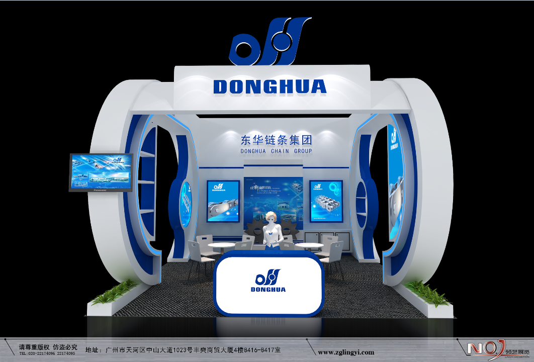 契合東華鏈條的品牌形象和產品特性,采用弧形、矩形結構,再搭配燈具燈光的效果,襯托出展位簡約、時尚的氛圍,突出一種現代、簡約的時尚品味。