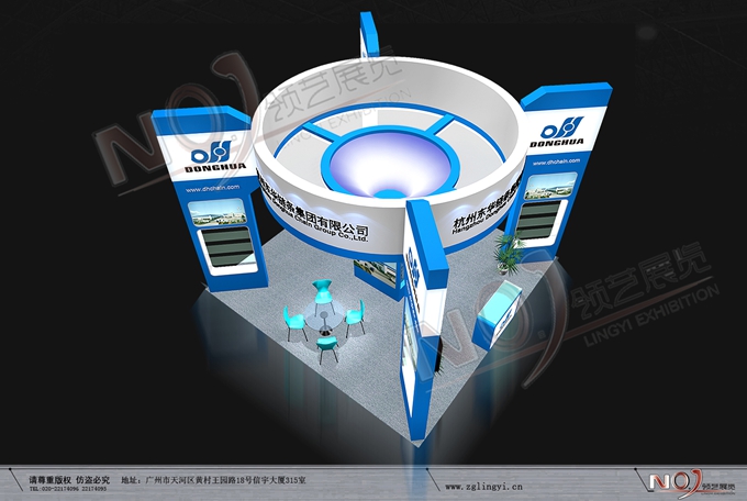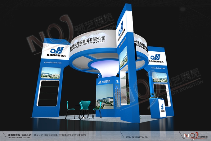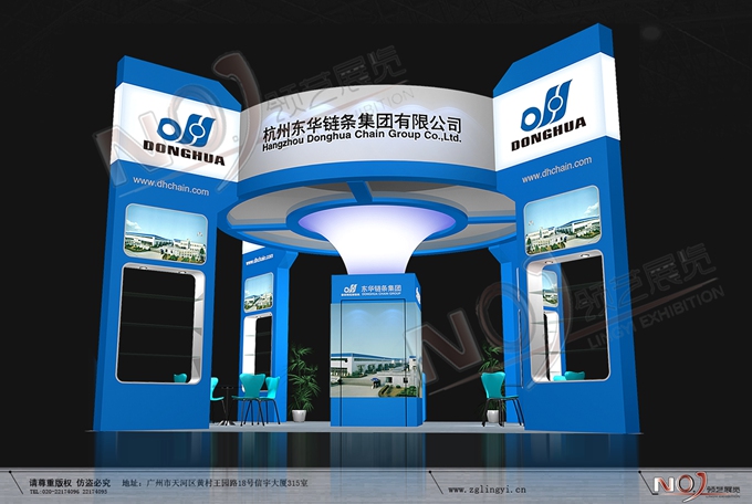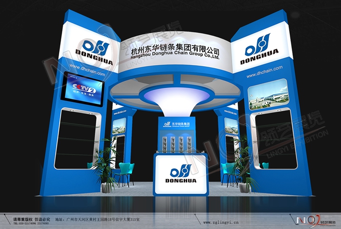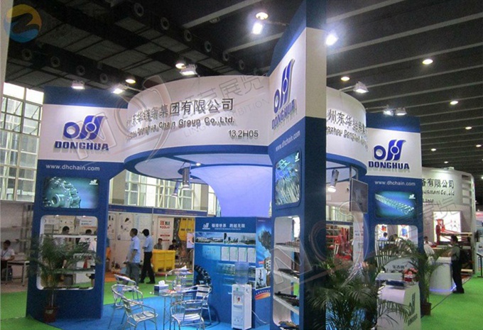 契合東華鏈條的品牌形象和產品特性,采用矩形結構,再搭配燈具燈光的效果,襯托出展位高端、時尚的氛圍,突出一種現代、大氣的時尚品味。