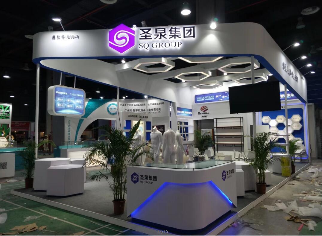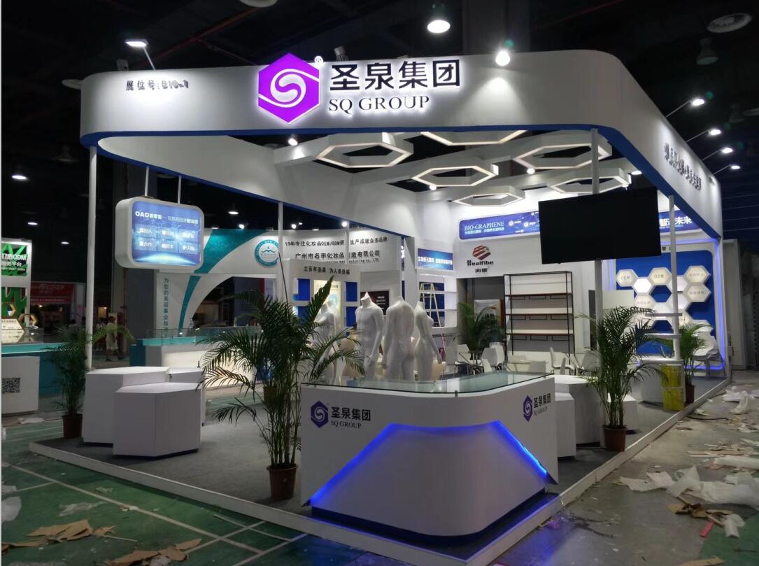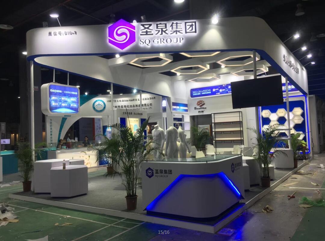 契合山東圣泉品牌形象和產品特性,利用天花造型,再搭配燈具燈光的效果,襯托出展位現代、突出一種現代、高端的時尚品味。