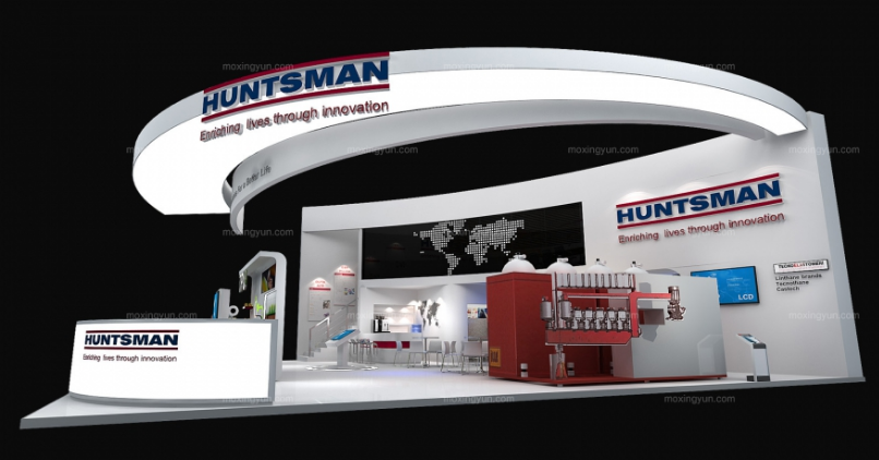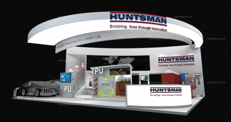 契合亨斯邁的品牌形象和產品特性,采用曲線、框型結構,再搭配燈具燈光的效果,襯托出展位簡約、融合的氛圍,突出一種高端、舒適的時尚品味。