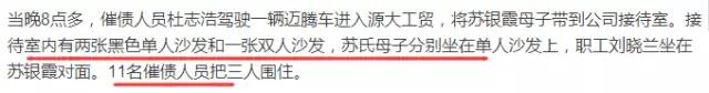 事情起因是這樣的,蘇銀霞開辦的公司資金周轉遇困,不得已向吳學占借款共計135萬元,約定月利息10%(遠超法律規定的36%年利息上限)。在蘇銀霞共還款184萬元,并將一套140平米價值70萬的房子抵債后,“還剩最后17萬欠款,公司實在還不起了”。結果,就遭到涉黑勢力的恐怖逼債。