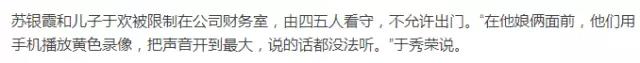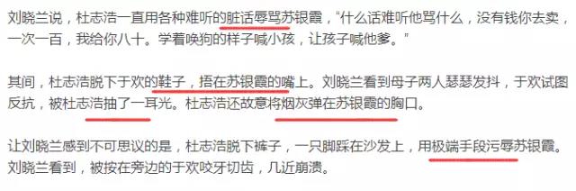 吳學占讓手下拉屎,并將蘇銀霞按進馬桶里,要求還錢。案發當天,蘇銀霞和于歡母子被關在了一起?!笆裁丛掚y聽他罵什么,沒有錢你去賣,一次一百,我給你八十。學著喚狗的樣子喊小孩,讓孩子喊他爹?!倍胖竞泼撓掠跉g的鞋子,捂在蘇銀霞的嘴上。杜志浩脫下褲子,一只腳踩在沙發上,用極端手段污辱蘇銀霞。一個小時后,失控的于歡,抄起水果刀瘋狂捅向逼債者,結果四人中刀,其中杜志浩失血過多死亡。