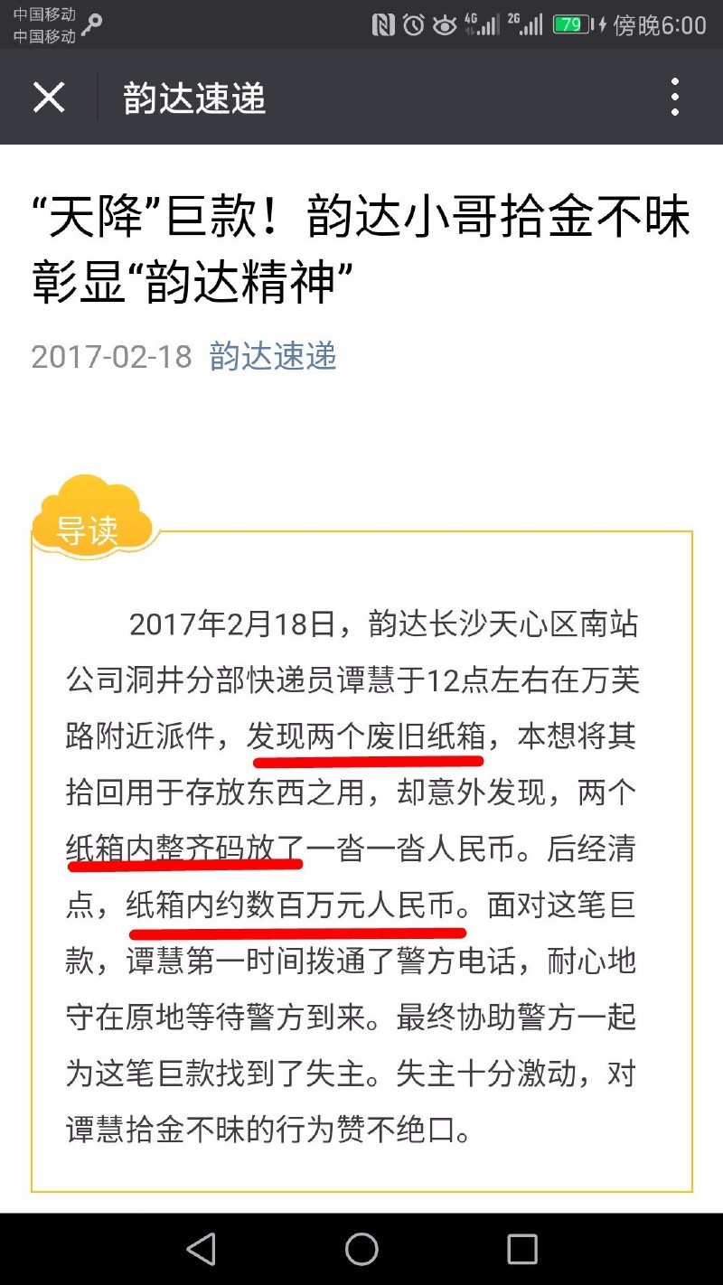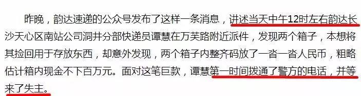2月18日中午,長沙市洞井安置小區韻達快遞的員工譚慧在雨花區萬芙路長安郡小區二期門前馬路邊撿到一疊現金,給同在一個公司上班的堂哥譚某勝打電話開玩笑說撿到兩箱錢,估計有幾百萬。堂哥讓譚慧報警,但譚慧并沒有報警,也未告知真相,而是原地等待失主十分鐘左右后離開,去往洞井一小區與譚某勝匯合,并拿出撿到錢說是失主給的感謝費。經清點,發現有1000元錢。當日下午,公司負責人之一陳某找其核實情況,并要求他問清處警的民警姓名,于是譚慧撥打110,但未說話。后來,因為面子因素和擔心被責怪一直沒說出實情,還編造出撿到四、五百萬并報警,有疑似特警人員處警辦理此事,并以此答復媒體。