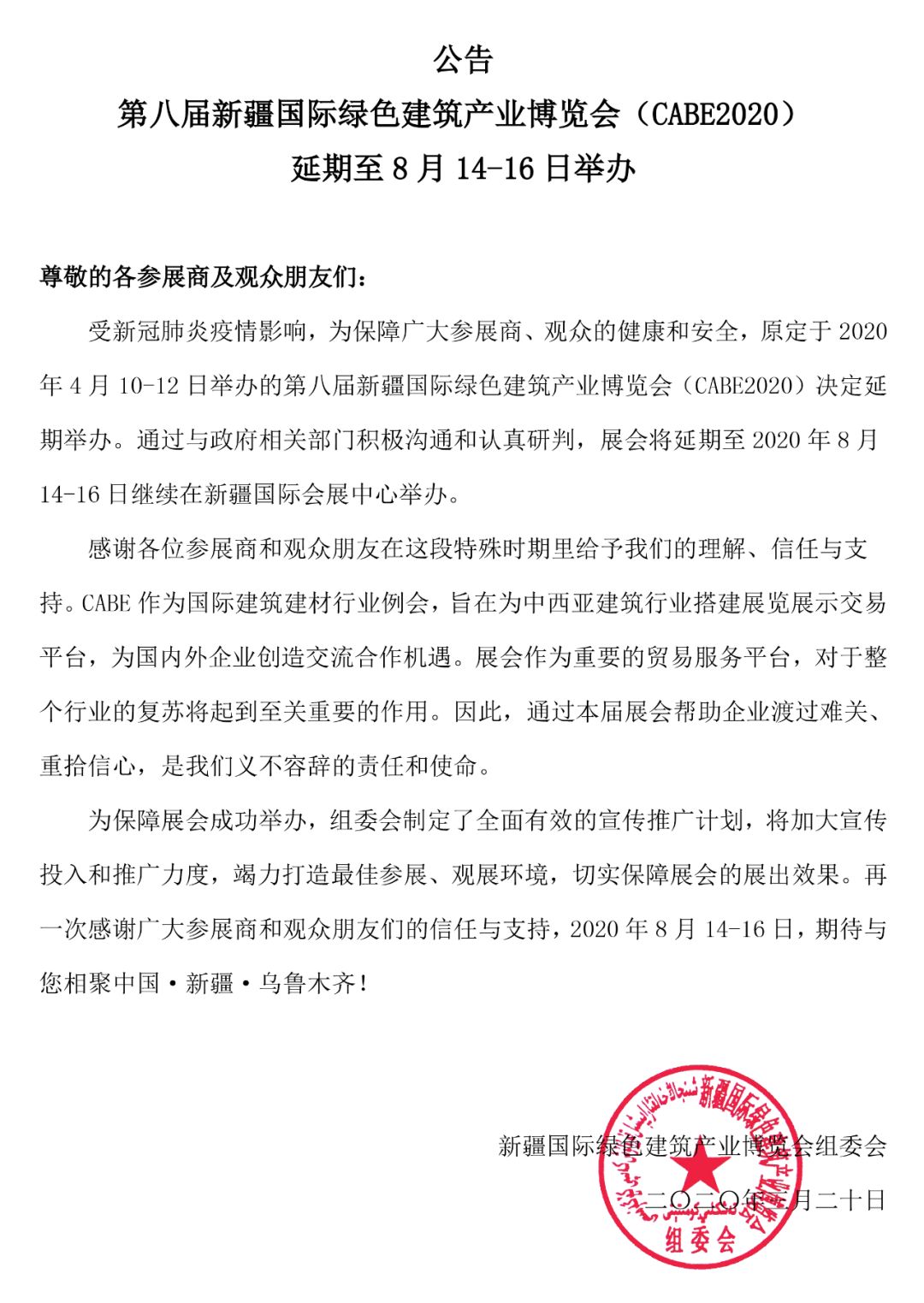 根據建博會設計搭建公司領藝展覽了解到,受新冠肺炎疫情影響,原定于2020年4月10-12日舉辦的第八屆新疆國際綠色建筑產業博覽會(CABE2020),將延期至8月14日至16日在新疆國際會展中心舉行,歡迎您屆時參展參觀。如需建博會設計請聯系領藝展覽,希望我們能在建博會搭建上為您添磚加瓦,祝各位朋友收獲多多,滿載而歸!