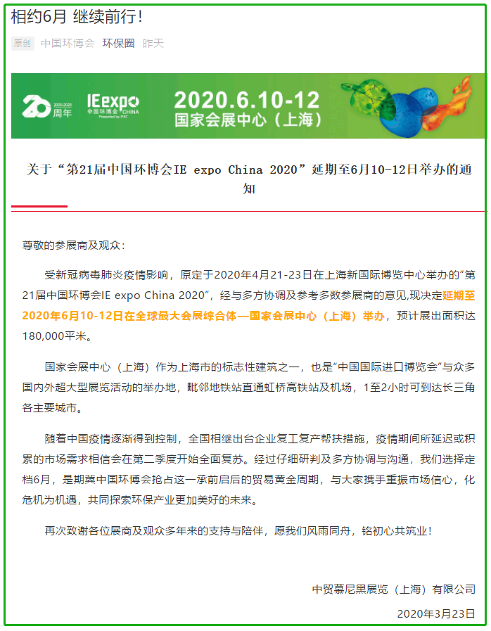 根據環博會設計搭建公司領藝展覽了解到,原定于2020年4月21-23日在上海新國際博覽中心舉辦的“第21屆中國環博會IE expo China 2020”,經與多方協調及參考多數參展商的意見,現決定延期至2020年6月10-12日在全球最大會展綜合體—國家會展中心(上海)舉辦,預計展出面積達180,000平米。如需環博會設計請聯系領藝展覽,希望我們能在環博會搭建上為您添磚加瓦,祝各位朋友收獲多多,滿載而歸!