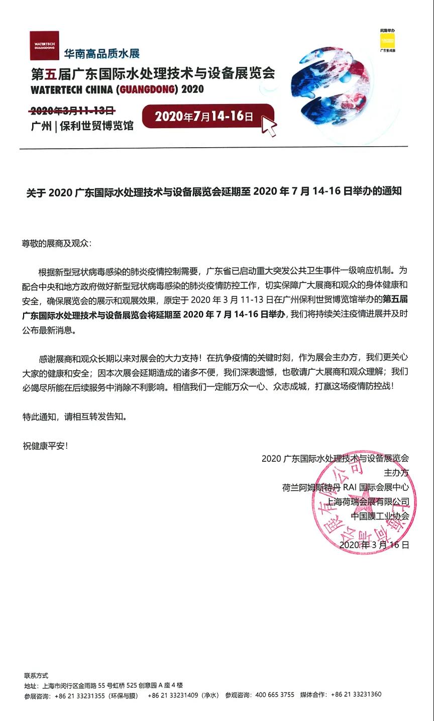 根據國際水展設計搭建公司領藝展覽了解到,受新冠肺炎疫情影響,原定于2020年3月11-13日在廣州保利世貿博覽館舉辦的2020廣東國際水處理技術與設備展覽會將延期至2020年7月14-16日舉辦。。如需國際水展設計請聯系領藝展覽,希望我們能在國際水展搭建上為您添磚加瓦,祝各位朋友收獲多多,滿載而歸!