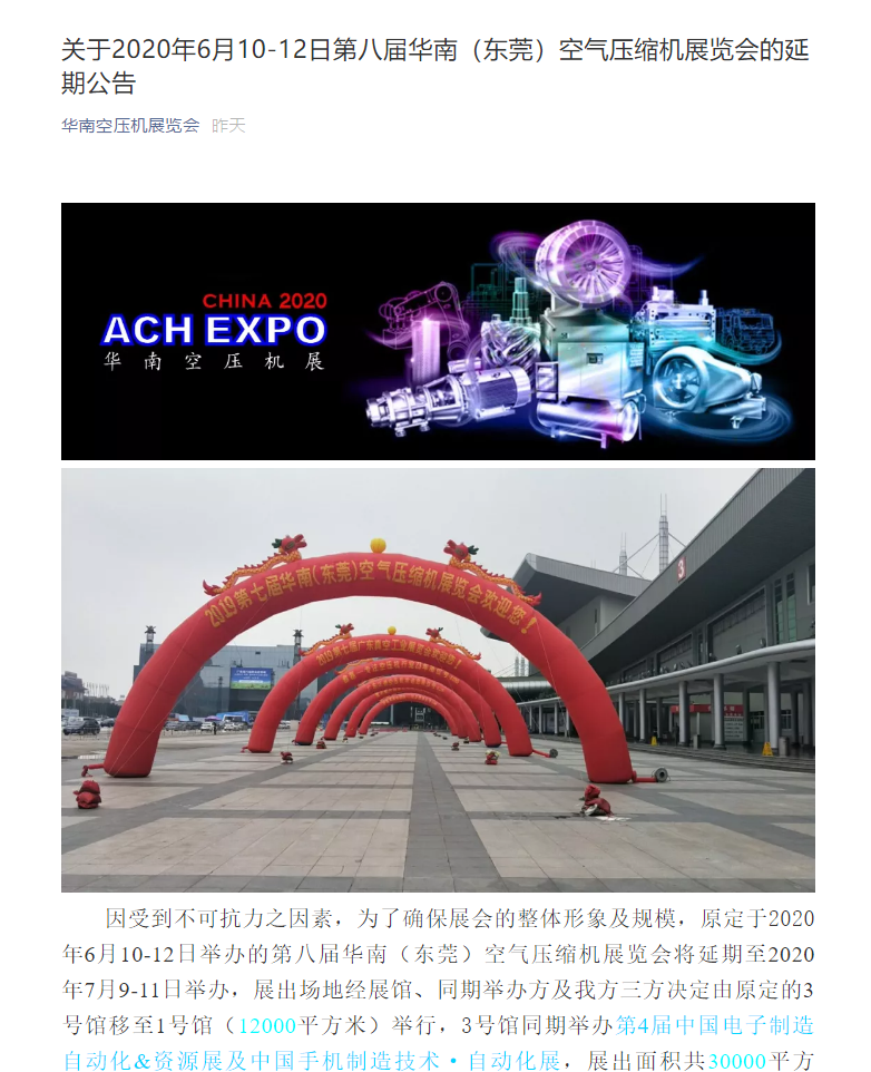 根據空壓機展設計搭建公司領藝展覽了解到,原定于2020年6月10-12日舉辦的第八屆華南(東莞)空氣壓縮機展覽會將延期至2020年7月9-11日舉辦,展出場地經展館、同期舉辦方及我方三方決定由原定的3號館移至1號館(12000平方米)舉行,3號館同期舉辦第4屆中國電子制造自動化&資源展及中國手機制造技術·自動化展,展出面積共30000平方米,這將為此次展會帶來更專業、更有實效性的展出成果。如需空壓機展設計請聯系領藝展覽,希望我們能在空壓機展搭建上為您添磚加瓦,祝各位朋友收獲多多,滿載而歸!