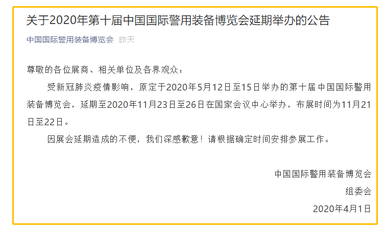 根據警博會設計搭建公司領藝展覽了解到,受新冠肺炎疫情影響,原定于2020年5月12日至15日舉辦的第十屆中國國際警用裝備博覽會,延期至2020年11月23日至26日在國家會議中心舉辦,布展時間為11月21日至22日。如需警博會設計請聯系領藝展覽,希望我們能在警博會搭建上為您添磚加瓦,祝各位朋友收獲多多,滿載而歸!