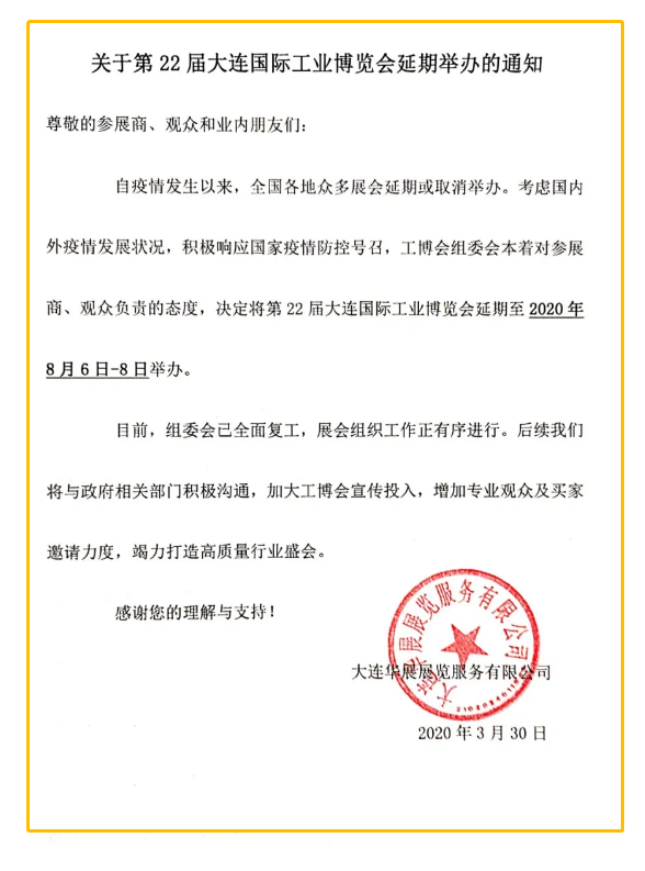 根據工博會設計搭建公司領藝展覽了解到,受疫情影響,第22屆大連國際工業博覽會延期舉辦,時間確定為2020年8月6日 —8日。如需工博會設計請聯系領藝展覽,希望我們能在工博會搭建上為您添磚加瓦,祝各位朋友收獲多多,滿載而歸!