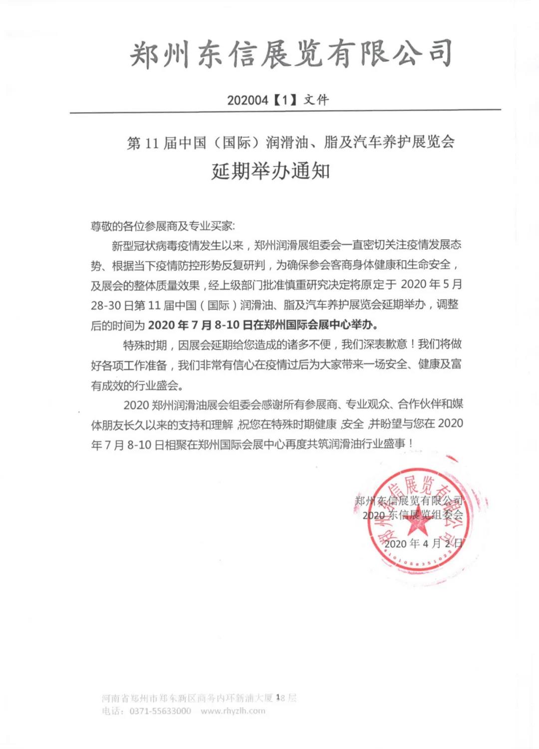 根據潤滑油展設計搭建公司領藝展覽了解到,受新冠肺炎疫情影響,原定于2020年5月28-30日舉辦的第11屆中國潤滑油、脂及汽車養護展覽會延期至2020年7月8-10日在鄭州國際會展中心舉辦。如需潤滑油展設計請聯系領藝展覽,希望我們能在潤滑油展搭建上為您添磚加瓦,祝各位朋友收獲多多,滿載而歸!