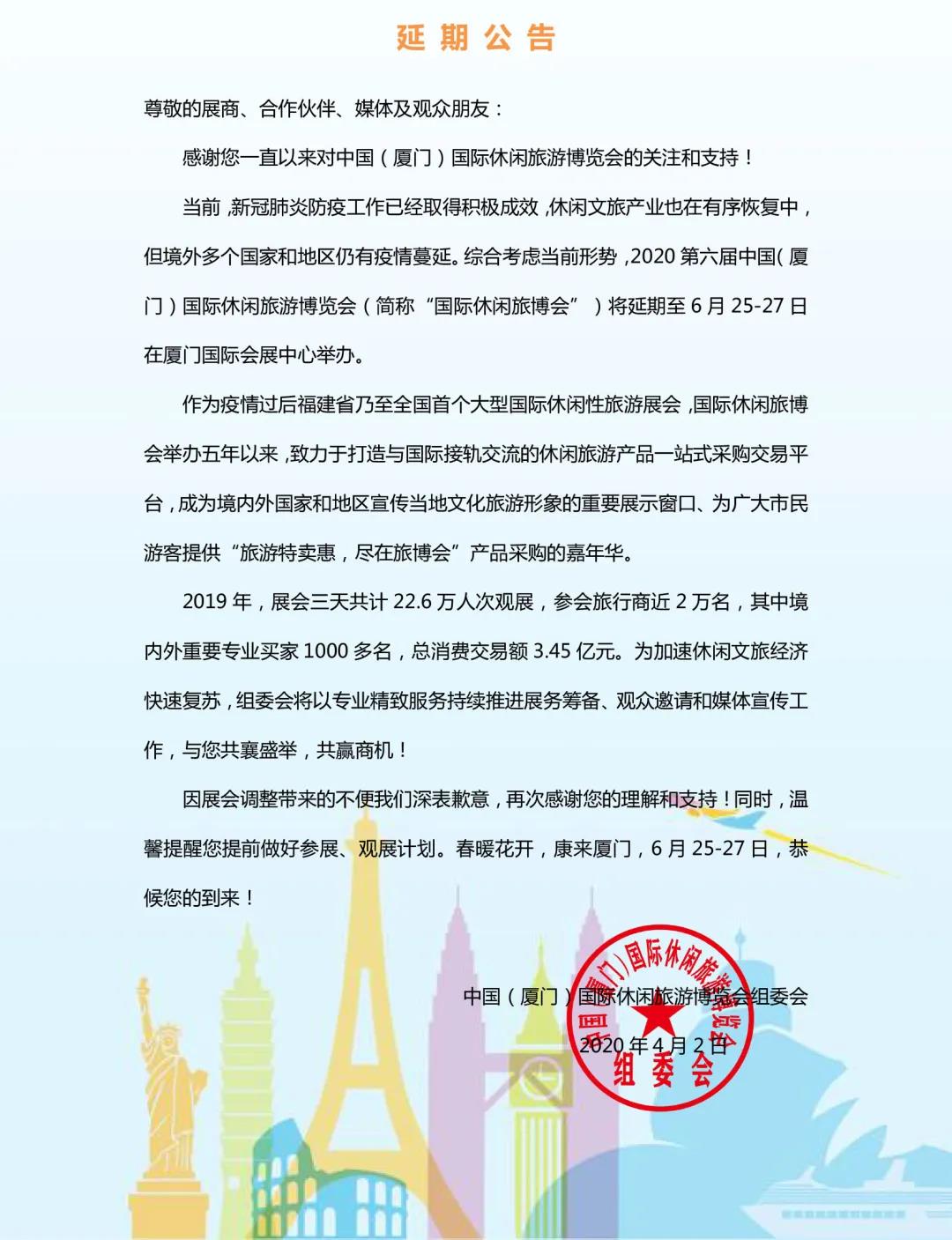 根據旅游展設計搭建公司領藝展覽了解到,2020第六屆中國(廈門)國際休閑旅游博覽會將延期至2020年6月25-27日舉行。如需旅游展設計請聯系領藝展覽,希望我們能在旅游展搭建上為您添磚加瓦,祝各位朋友收獲多多,滿載而歸!