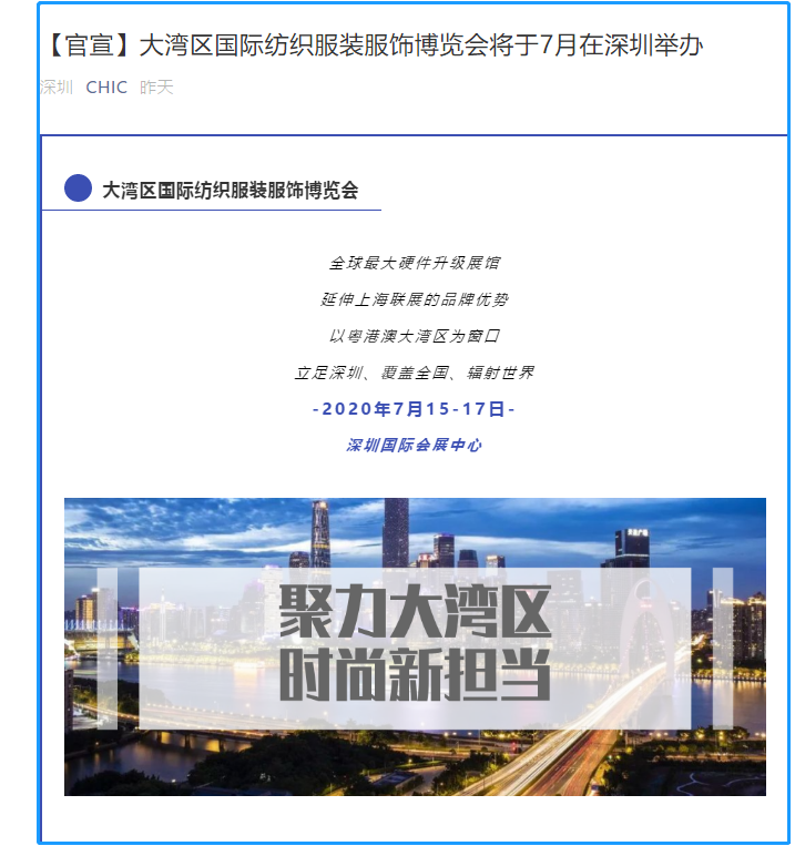根據服裝展設計搭建公司領藝展覽了解到,中國紡織工業聯合會應運推出大灣區國際紡織服裝服飾博覽會(簡稱“大灣區紡博會”),集結四大專業展會——大灣區國際紡織面料及輔料博覽會、大灣區國際服裝服飾博覽會、大灣區國際針織博覽會、大灣區國際紡織紗線博覽會,將以近12萬平方米的展出規模,于2020年7月15日~17日亮相深圳國際會展中心。如需服裝展設計請聯系領藝展覽,希望我們能在服裝展搭建上為您添磚加瓦,祝各位朋友收獲多多,滿載而歸!