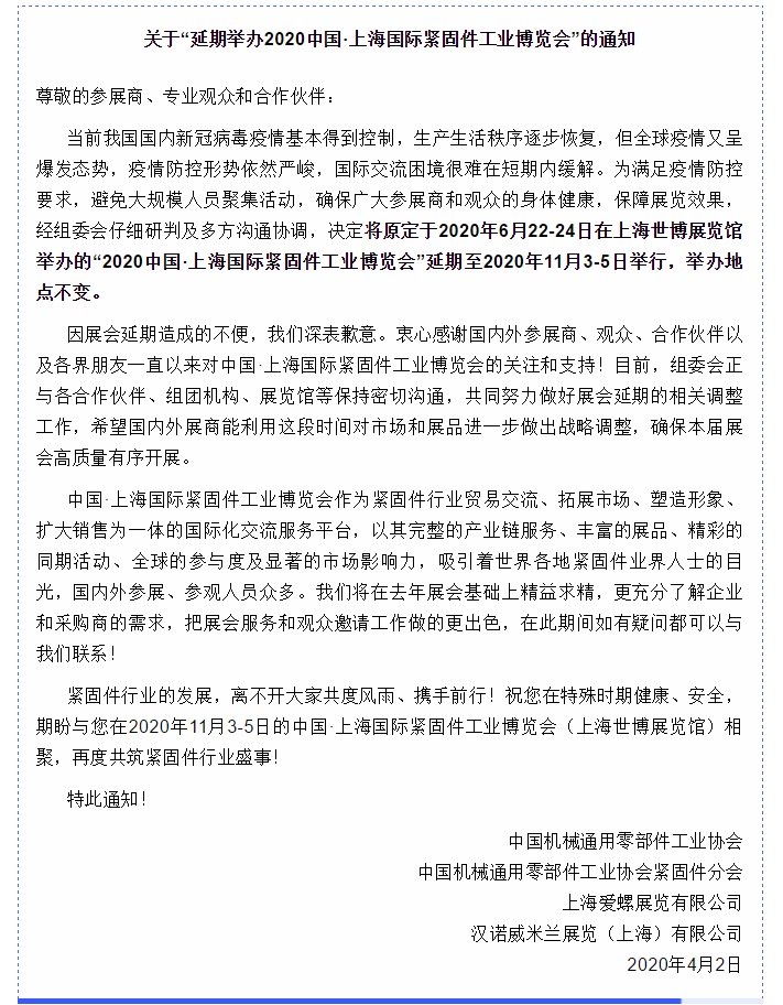 根據緊博會設計搭建公司領藝展覽了解到,受新冠肺炎疫情影響,原定于2020年6月22-24日在上海世博展覽館舉辦的“2020中國·上海國際緊固件工業博覽會”延期至2020年11月3-5日舉行,舉辦地點不變。如需緊博會設計請聯系領藝展覽,希望我們能在緊博會搭建上為您添磚加瓦,祝各位朋友收獲多多,滿載而歸!