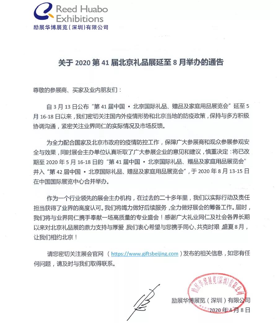 根據禮品展設計搭建公司領藝展覽了解到,為全力配合國家及北京市政府的疫情防控工作,保障廣大參展商和觀眾參展參觀安全與效果,同時展會主辦單位認真聽取了廣大參展企業的意見和建議,慎重決定:將已改期至2020年5月16-18日的“第41屆中國?北京國際禮品、贈品及家庭用品展覽會”并入“第42屆中國?北京國際禮品、贈品及家庭用品展覽會”,于2020年8月13-15日在北京·中國國際展覽中心(靜安莊館)合并舉辦。如需禮品展設計請聯系領藝展覽,希望我們能在禮品展搭建上為您添磚加瓦,祝各位朋友收獲多多,滿載而歸!