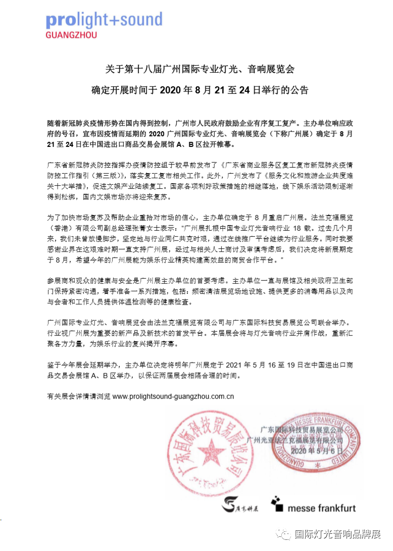 廣州燈光音響展設計搭建公司領藝展覽了解到,隨著新冠肺炎疫情形勢在國內得到控制,廣州市人民政府鼓勵企業有序復工復產。主辦單位響應政府的號召,宣布因疫情而延期的2020廣州國際專業燈光、音響展覽會(下稱廣州展)確定于8月21至24日在中國進出口商品交易會展館A、B區拉開帷幕。如需廣州燈光音響展設計請聯系領藝展覽,希望我們能在廣州燈光音響展搭建上為您添磚加瓦,祝各位朋友收獲多多,滿載而歸!