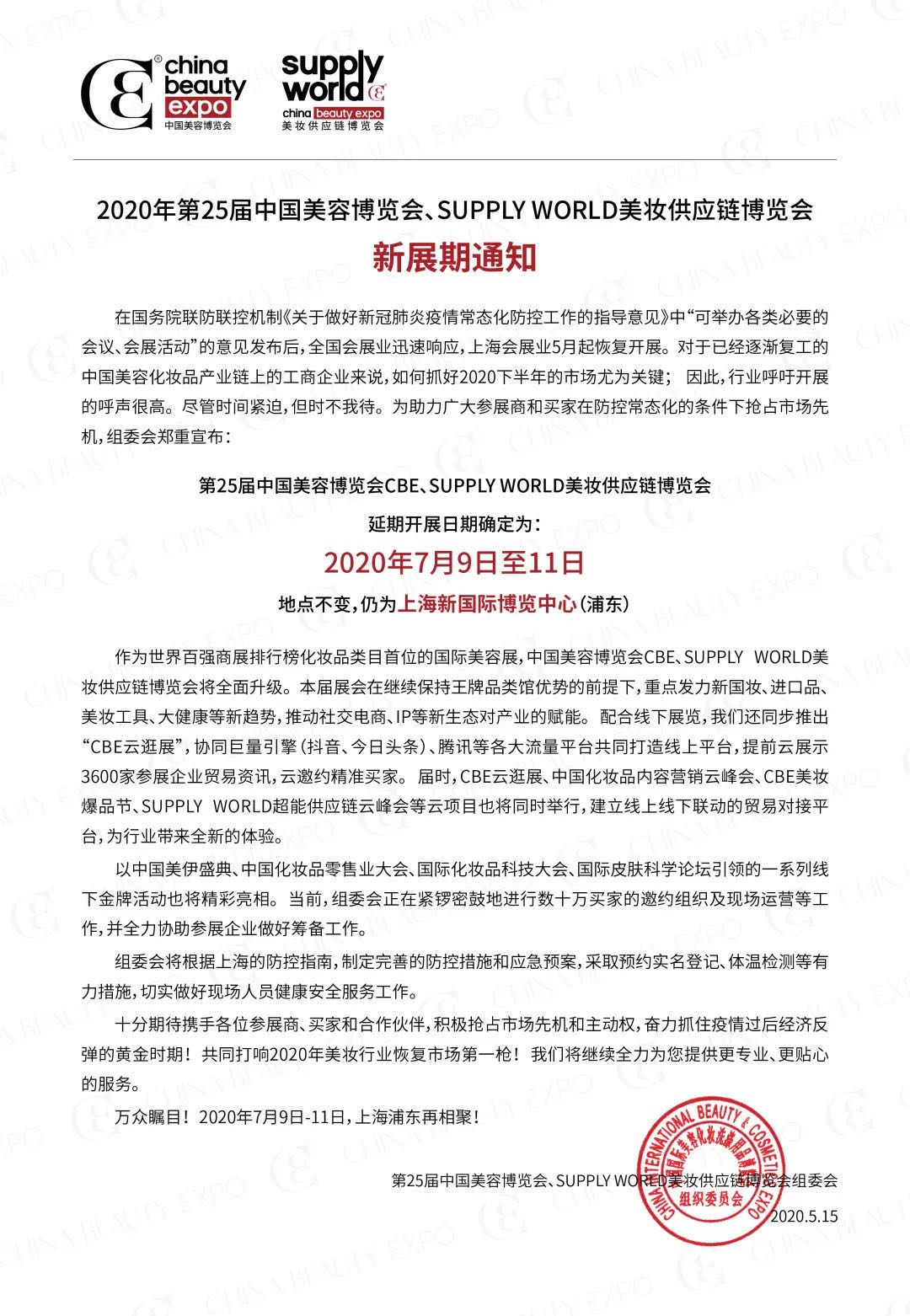 根據美容博覽會指定設計搭建公司領藝展覽了解到,原定于2020年5月19日至21日在上海新國際博覽中心舉辦的第25屆中國美容博覽會CBE、SUPPLY WORLD美妝供應鏈博覽會及所有同期相關活動,將延期至2020年7月9-11日舉行,舉辦地點不變。如需美容博覽會設計請聯系領藝展覽,希望我們能在美容博覽會搭建上為您添磚加瓦,祝各位朋友收獲多多,滿載而歸!