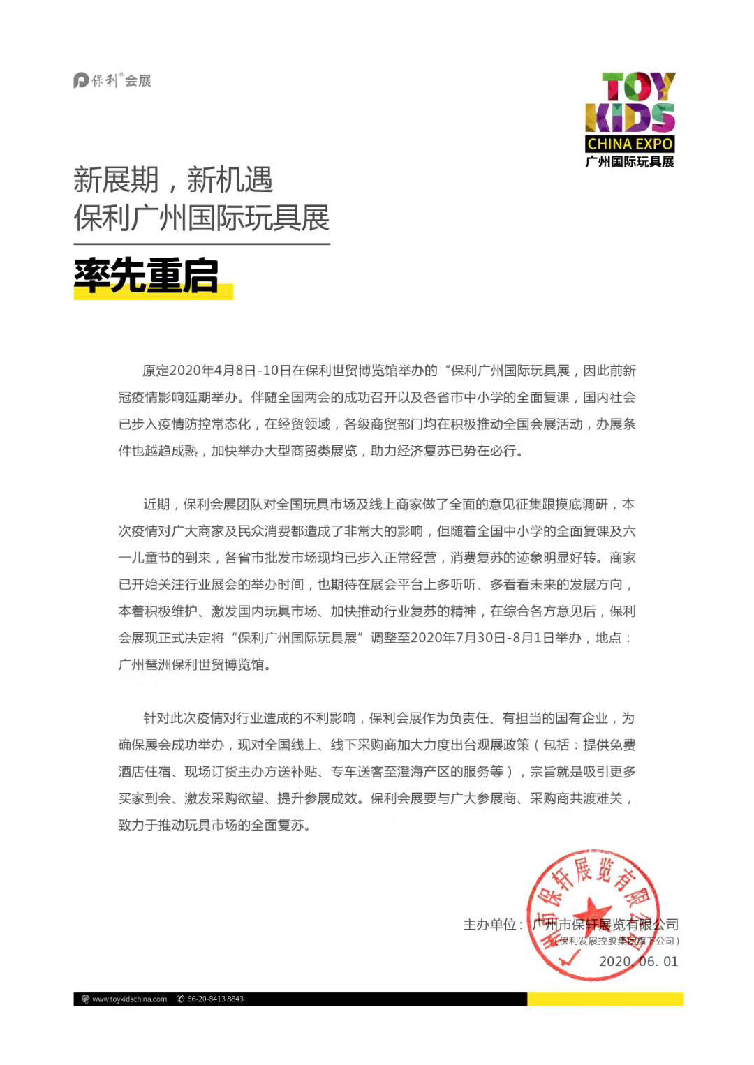 廣州玩具展設計搭建公司領藝展覽了解到,原定于2020年4月8日舉行的“保利廣州國際玩具展”調整至2020年7月30日-8月1日舉行。如需廣州玩具展設計請聯系領藝展覽,希望我們能在廣州玩具展搭建上為您添磚加瓦,祝各位朋友收獲多多,滿載而歸!