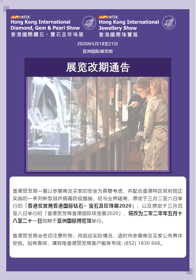 根據香港珠寶展設計搭建公司領藝展覽解到,原定于三月二至六日舉行的「香港貿發局香港國際鉆石丶寶石及珍珠展2020」,以及原定于三月四至八日舉行的「香港貿發局香港國際珠寶展2020」,將改為二零二零年五月十八至二十一日同期于亞洲國際博覽館舉行。如需香港珠寶展設計請聯系領藝展覽,希望我們能在香港珠寶展搭建上為您添磚加瓦,祝各位朋友收獲多多,滿載而歸!