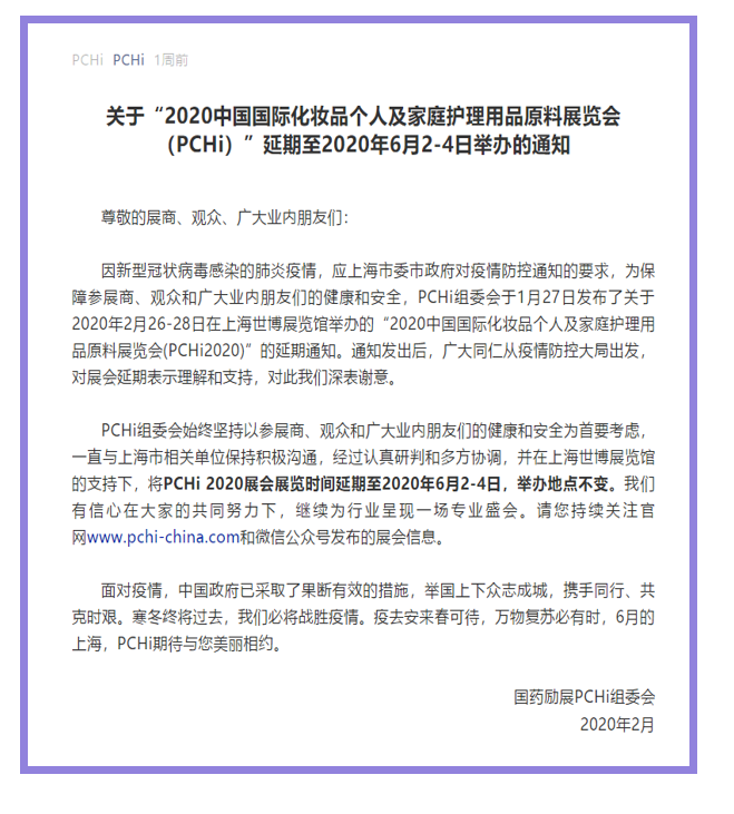 根據上海家庭護理展設計搭建公司領藝展覽了解到,因新型冠狀病毒感染的肺炎疫情,應上海市委市政府對疫情防控通知的要求,為保障參展商、觀眾和廣大業內朋友們的健康和安全,PCHi組委會于1月27日發布了關于2020年2月26-28日在上海世博展覽館舉辦的“2020中國國際化妝品個人及家庭護理用品原料展覽會(PCHi2020)”的延期通知。將PCHi 2020展會展覽時間延期至2020年6月2-4日,舉辦地點不變。我們將繼續密切關注展會動態,希望我們能在上海家庭護理展搭建上為您添磚加瓦,祝各位朋友收獲多多,滿載而歸!嚴寒終將過去,春天必將來臨。上海家庭護理展設計搭建公司領藝展覽向抗疫一線的所有英雄致敬!