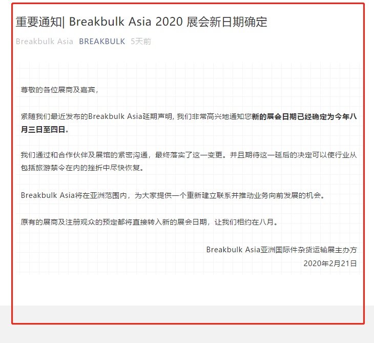 根據亞洲國際件雜貨運輸展設計搭建公司領藝展覽了解到,緊隨著主辦最近發布的Breakbulk Asia延期聲明, 我們非常高興地通知原定于2020年3月18日至19日在上海世博展覽館舉辦的Breakbulk Asia亞洲國際件雜貨運輸展覽會新的展會日期已經確定為今年八月三日至四日。如需物流展設計請聯系領藝展覽,希望我們能在物流展搭建上為您添磚加瓦,祝各位朋友收獲多多,滿載而歸!