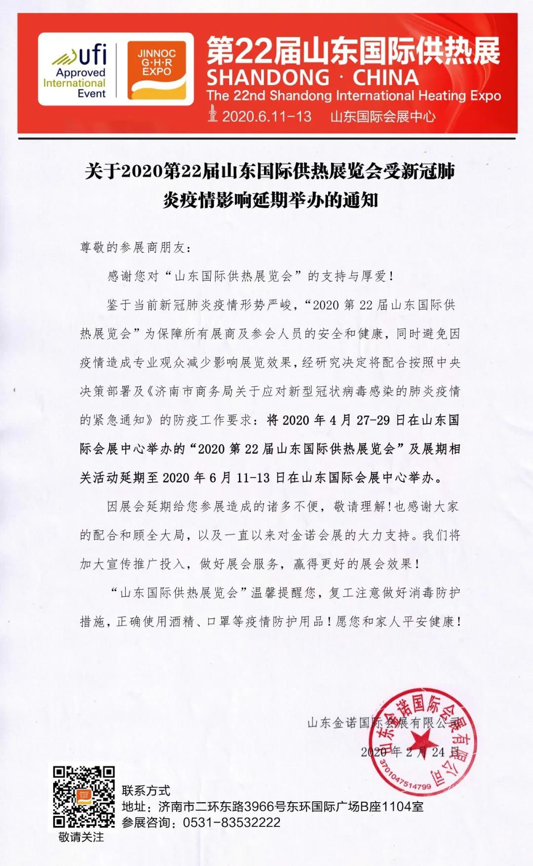 根據供熱展設計搭建公司領藝展覽了解到,受新冠病毒感染的肺炎疫情影響,第22屆山東國際供熱展延期至6月11到13日在濟南盛大召開。如需供熱展設計請聯系領藝展覽,希望我們能在供熱展搭建上為您添磚加瓦,祝各位朋友收獲多多,滿載而歸!