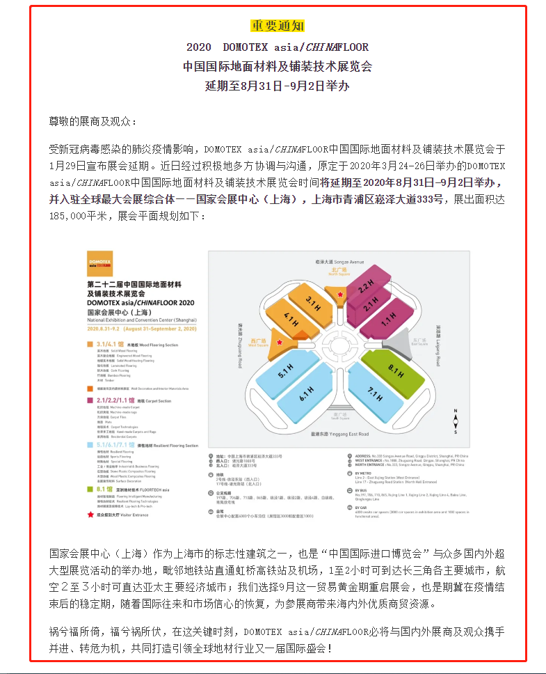 根據地材展設計搭建公司領藝展覽了解到,受新冠病毒感染的肺炎疫情影響,DOMOTEX asia/CHINAFLOOR中國國際地面材料及鋪裝技術展覽會于1月29日宣布展會延期。近日經過積極地多方協調與溝通,原定于2020年3月24-26日舉辦的DOMOTEX asia/CHINAFLOOR中國國際地面材料及鋪裝技術展覽會時間將延期至2020年8月31日-9月2日舉辦,并入駐全球最大會展綜合體——國家會展中心(上海),上海市青浦區崧澤大道333號。如需地材展設計請聯系領藝展覽,希望我們能在地材展搭建上為您添磚加瓦,祝各位朋友收獲多多,滿載而歸!