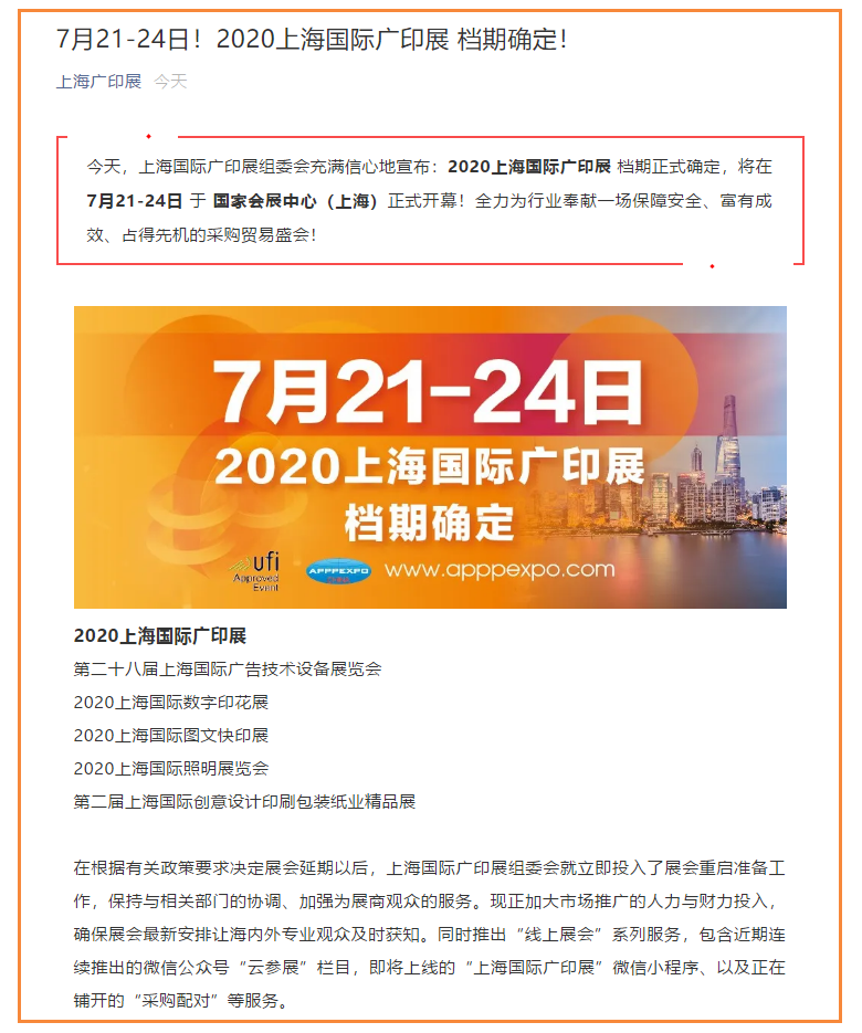 根據上海廣印展設計搭建公司領藝展覽了解到,今天,上海國際廣印展組委會充滿信心地宣布:2020上海國際廣印展 檔期正式確定,將在7月21-24日 于 國家會展中心(上海)正式開幕!全力為行業奉獻一場保障安全、富有成效、占得先機的采購貿易盛會!如需上海廣印展設計請聯系領藝展覽,希望我們能在上海廣印展搭建上為您添磚加瓦,祝各位朋友收獲多多,滿載而歸!