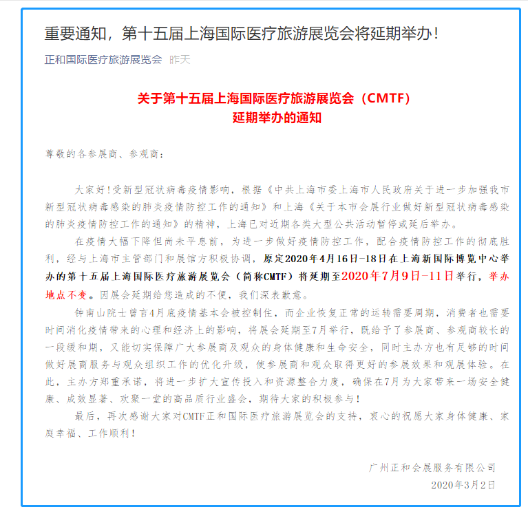 根據上海醫療展設計搭建公司領藝展覽了解到,原定2020年4月16日-18日在上海新國際博覽中心舉辦的第十五屆上海國際醫療旅游展覽會(簡稱CMTF)將延期至2020年7月9日-11日舉行,舉辦地點不變。如需上海醫療展設計請聯系領藝展覽,希望我們能在上海醫療展搭建上為您添磚加瓦,祝各位朋友收獲多多,滿載而歸!
