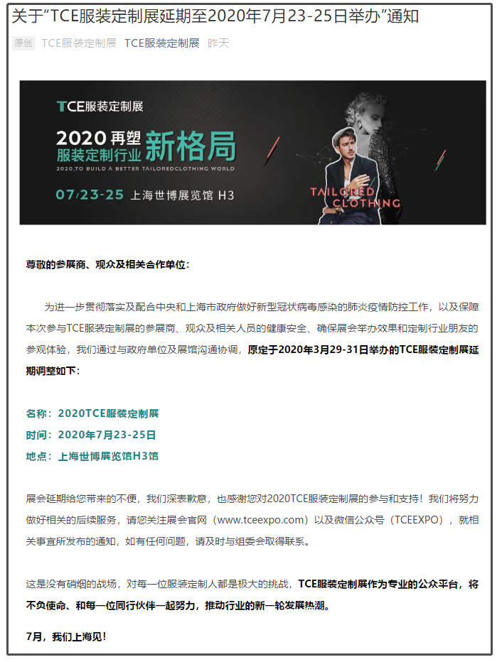 根據上海展臺設計搭建公司領藝展覽了解到,原定于2020年3月29-31日舉辦的TCE服裝定制展延期至2020年7月23-25日。一場高效鏈接產業資源、助推企業經濟發展的行業盛會即將再度呈現!盛夏七月,不見不散!如需服裝定制展展臺設計請聯系領藝展覽,希望我們能在服裝定制展展臺搭建上為您添磚加瓦,祝各位朋友收獲多多,滿載而歸!