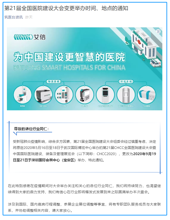 根據深圳展臺設計搭建公司領藝展覽了解到,受新冠肺炎疫情影響,綜合多方因素,第21屆全國醫院建設大會組委會經過慎重考慮,決定將原定2020年5月16日至18日于武漢國際博覽中心舉辦的第21屆CHCC全國醫院建設大會暨中國國際醫院建設、裝備及管理展覽會(以下簡稱:CHCC2020),更改為2020年9月19日至21日于深圳國際會展中心(寶安區)舉辦,特此通知。如需深圳展臺設計請聯系領藝展覽,希望我們能在深圳展臺搭建上為您添磚加瓦,祝各位朋友收獲多多,滿載而歸!
