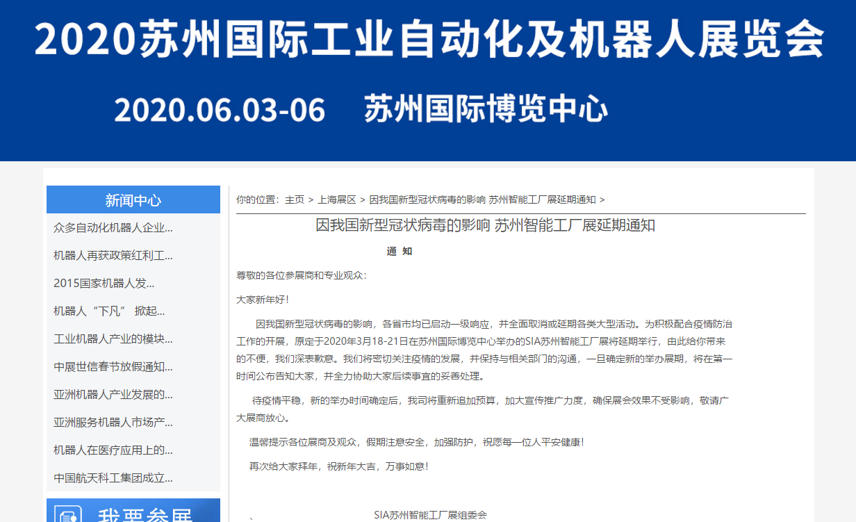 根據蘇州展臺設計搭建公司領藝展覽了解到,因我國新型冠狀病毒的影響,各省市均已啟動一級響應,并全面取消或延期各類大型活動。為積極配合疫情防治工作的開展,原定于2020年3月18-21日在蘇州國際博覽中心舉辦的SIA蘇州智能工廠展將延期舉行,如需蘇州展臺設計請聯系領藝展覽,希望我們能在蘇州展臺搭建上為您添磚加瓦,祝各位朋友收獲多多,滿載而歸!