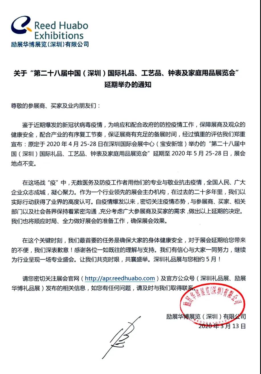 根據禮品展設計搭建公司領藝展覽了解到,原定于2020年4月25-28日在深圳國際會展中心(寶安新館)舉辦的“第二十八屆中國(深圳)國際禮品、工藝品、鐘表及家庭用品展覽會”延期至2020年5月25-28日,展會地點不變。如需禮品展設計請聯系領藝展覽,希望我們能在禮品展搭建上為您添磚加瓦,祝各位朋友收獲多多,滿載而歸!