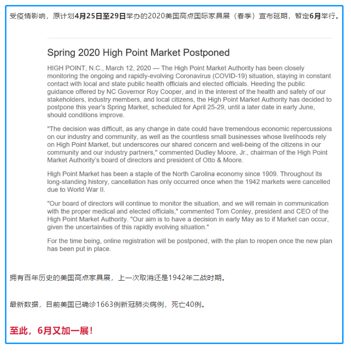 根據家具展設計搭建公司領藝展覽了解到,受疫情影響,原計劃4月25日至29日舉辦的2020美國高點國際家具展(春季)宣布延期,暫定6月舉行。如需家具展設計請聯系領藝展覽,希望我們能在家具展搭建上為您添磚加瓦,祝各位朋友收獲多多,滿載而歸!