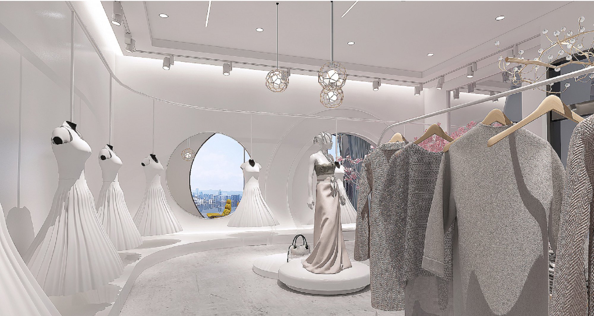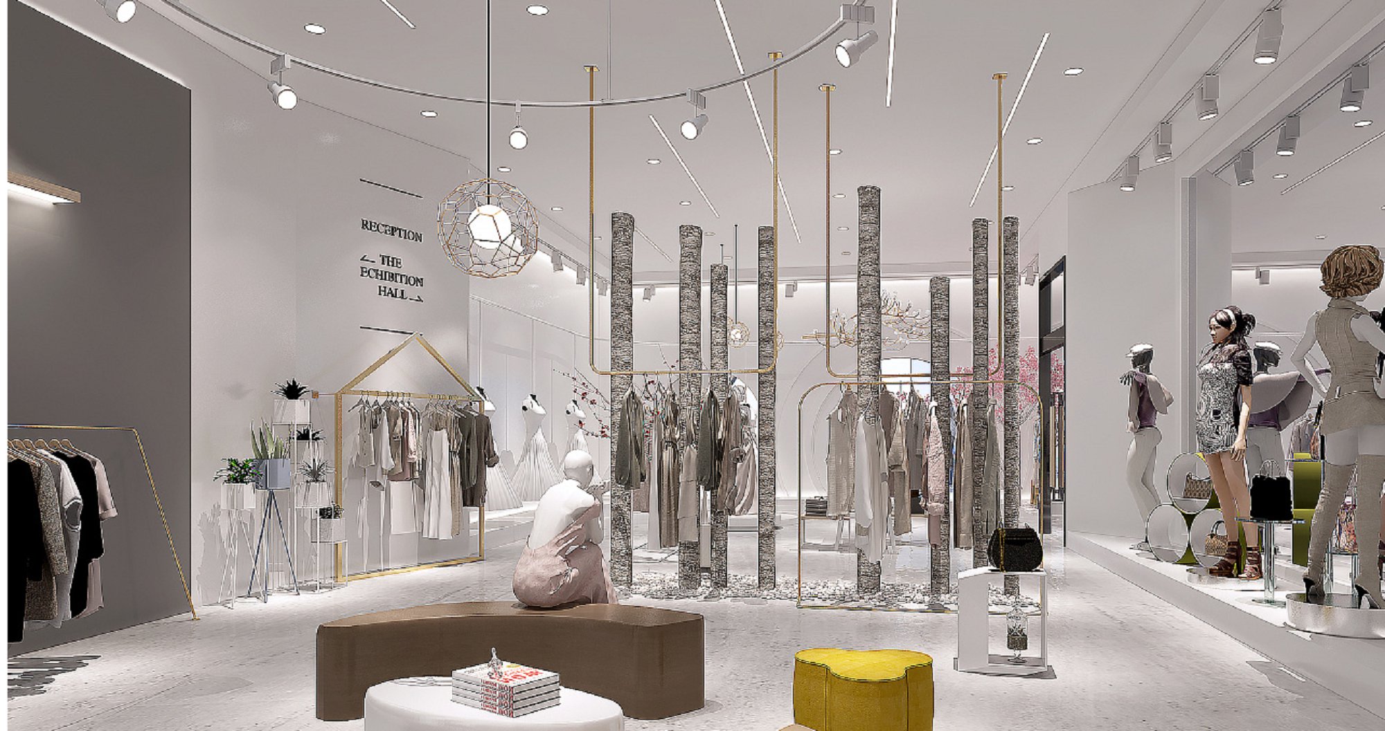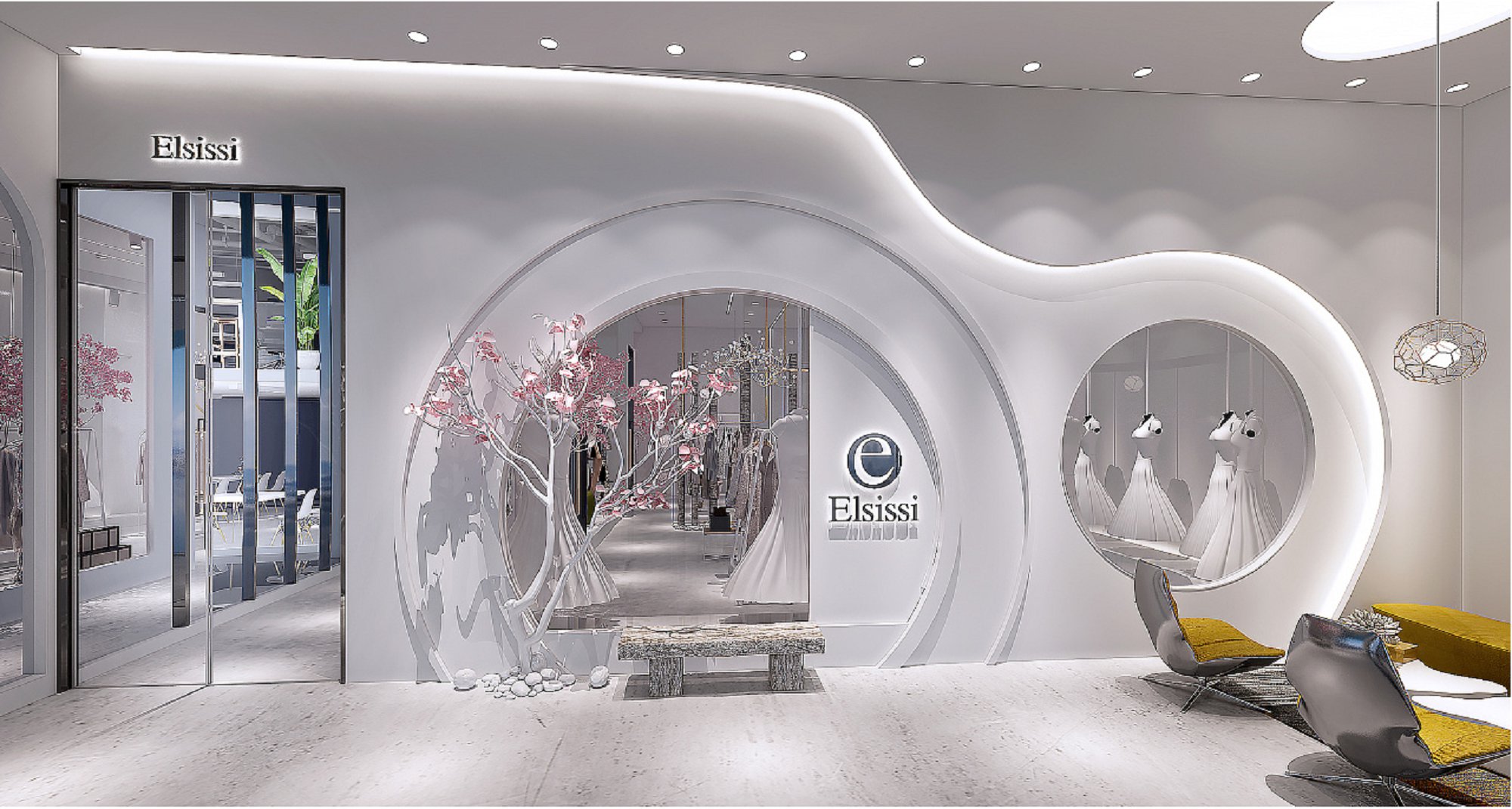契合EIsissil服裝的品牌形象和產品特性,采用開放式結構進行合理的分區,再搭配燈具燈光的效果,襯托出展廳大氣、豪華的氛圍,突出一種簡約、時尚的品味。
