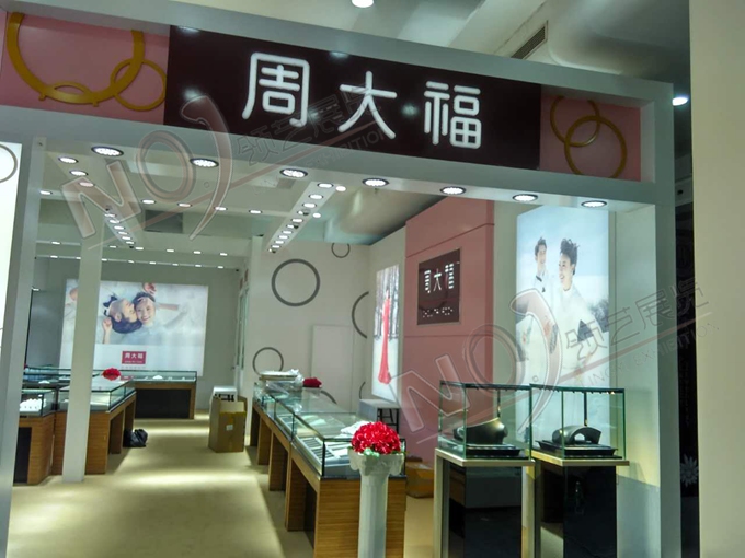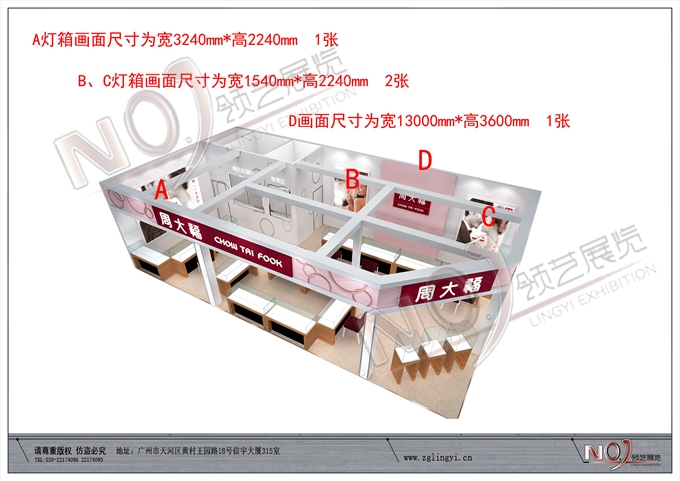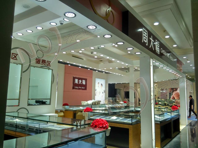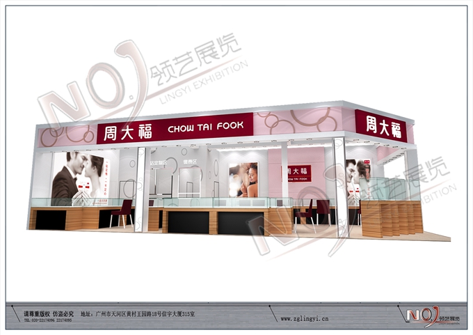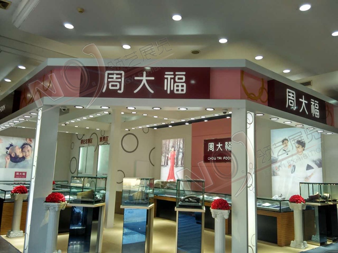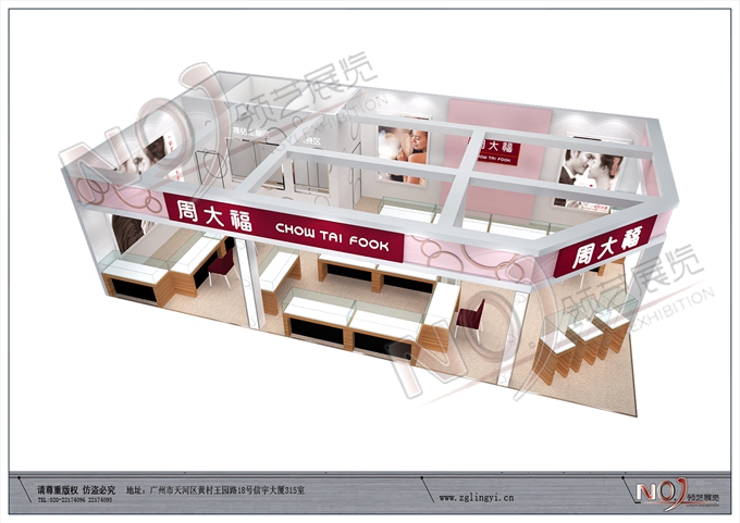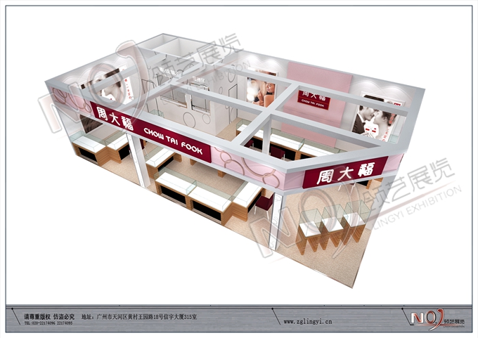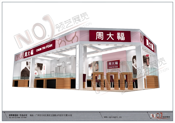 契合周大福的品牌形象和產品特性,采用矩形結構,再搭配燈具燈光的效果,襯托出展位高端、時尚的氛圍,突出一種現代、歐美的時尚品味。