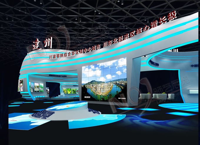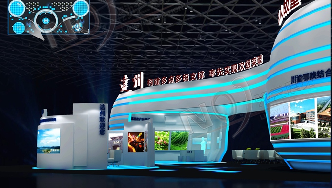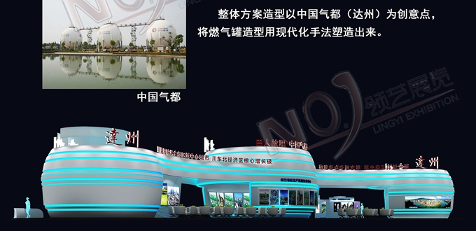 巧妙的運用白色、藍色作為搭配,著重突出達州“東大門”的特點,再搭配燈具燈光的效果,突出一種現代、高端的時尚品味,使整個展位主題鮮明又活力四射。
